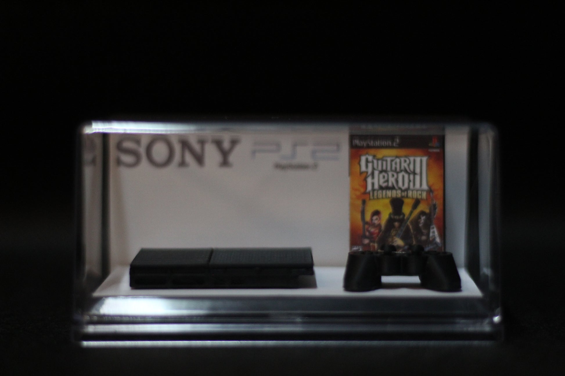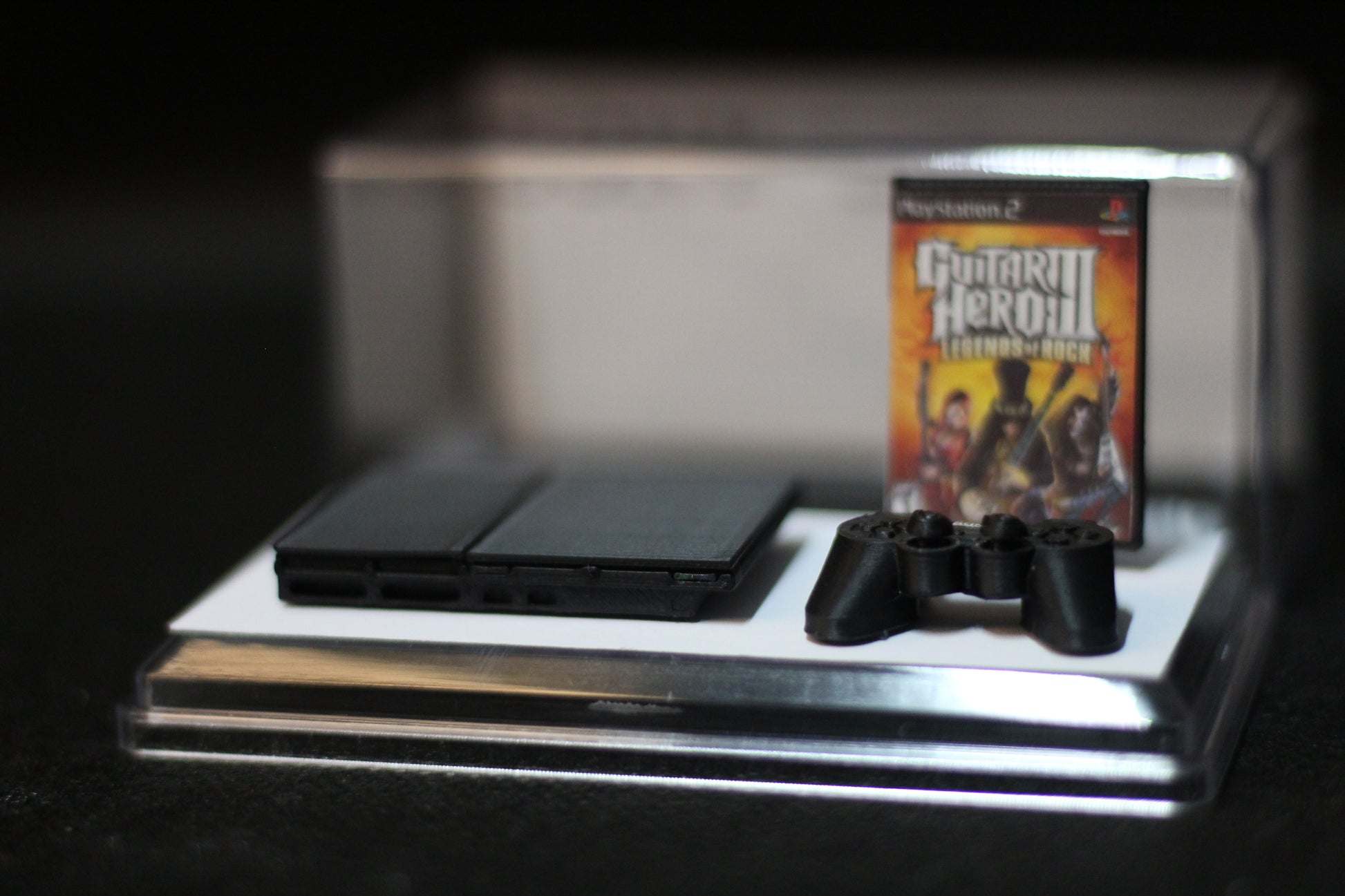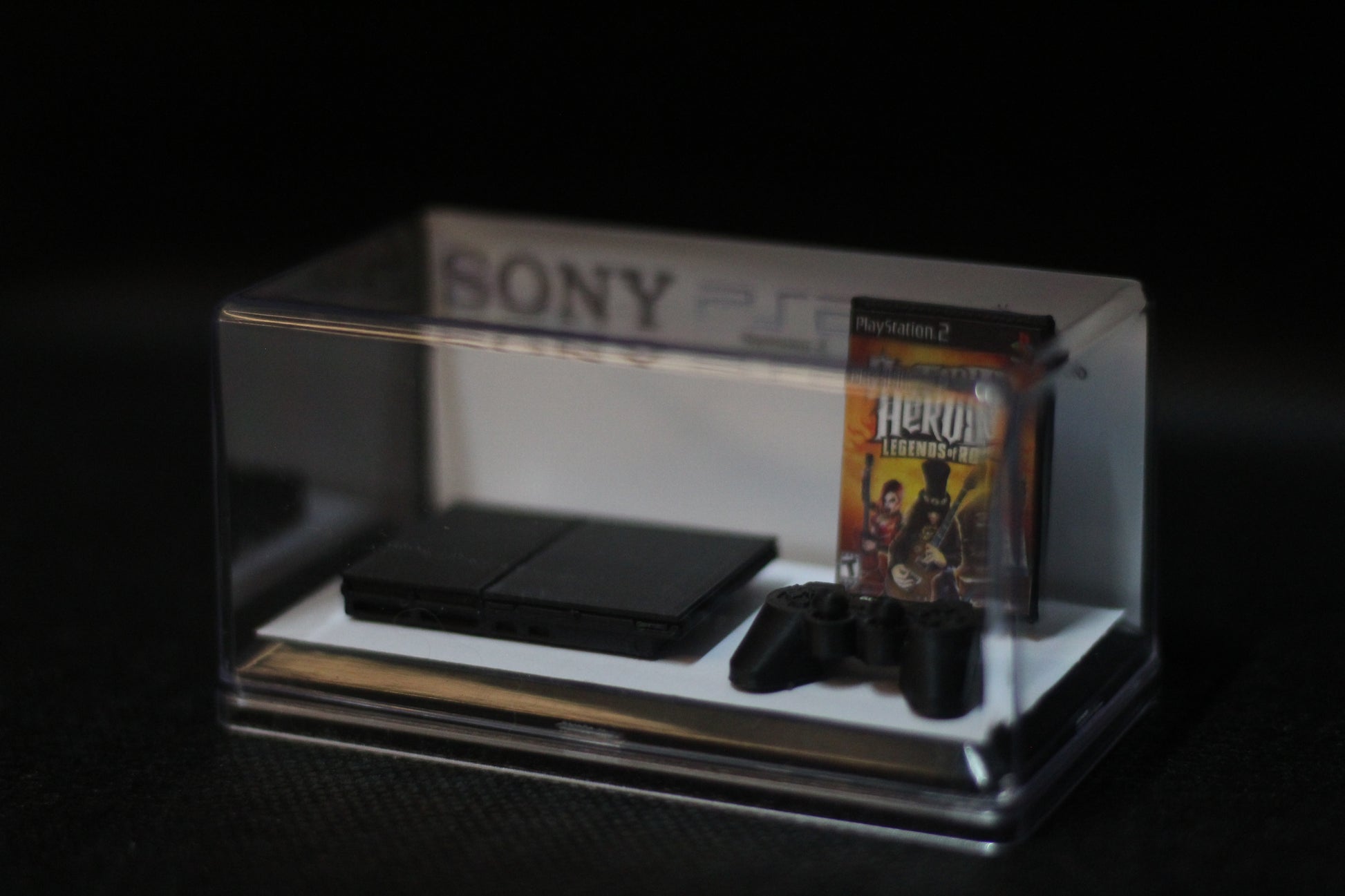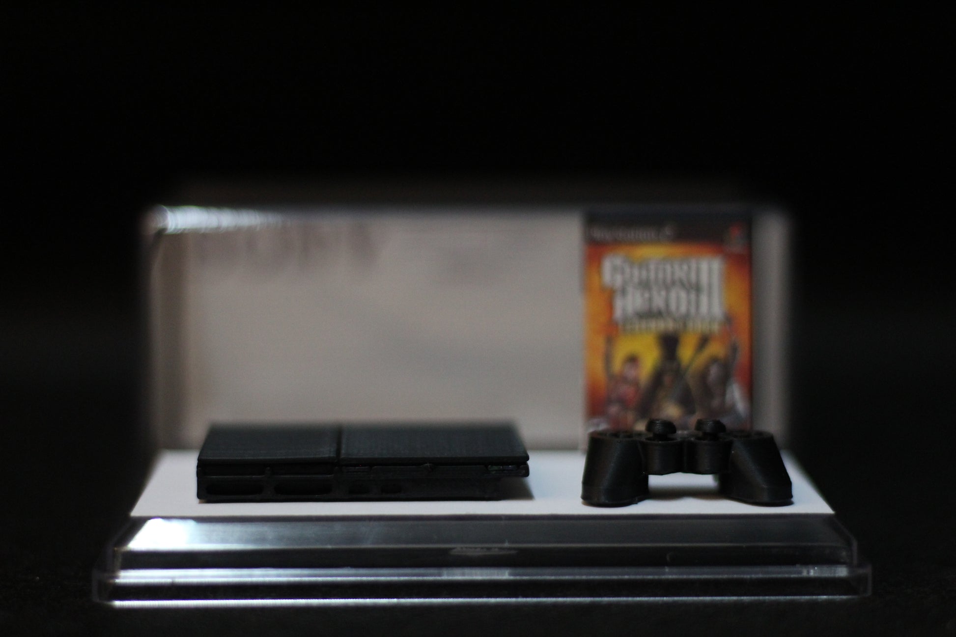 Miniatura Playstation 2 Slim colecionável, impressa 3D com alto nível de detalhes.